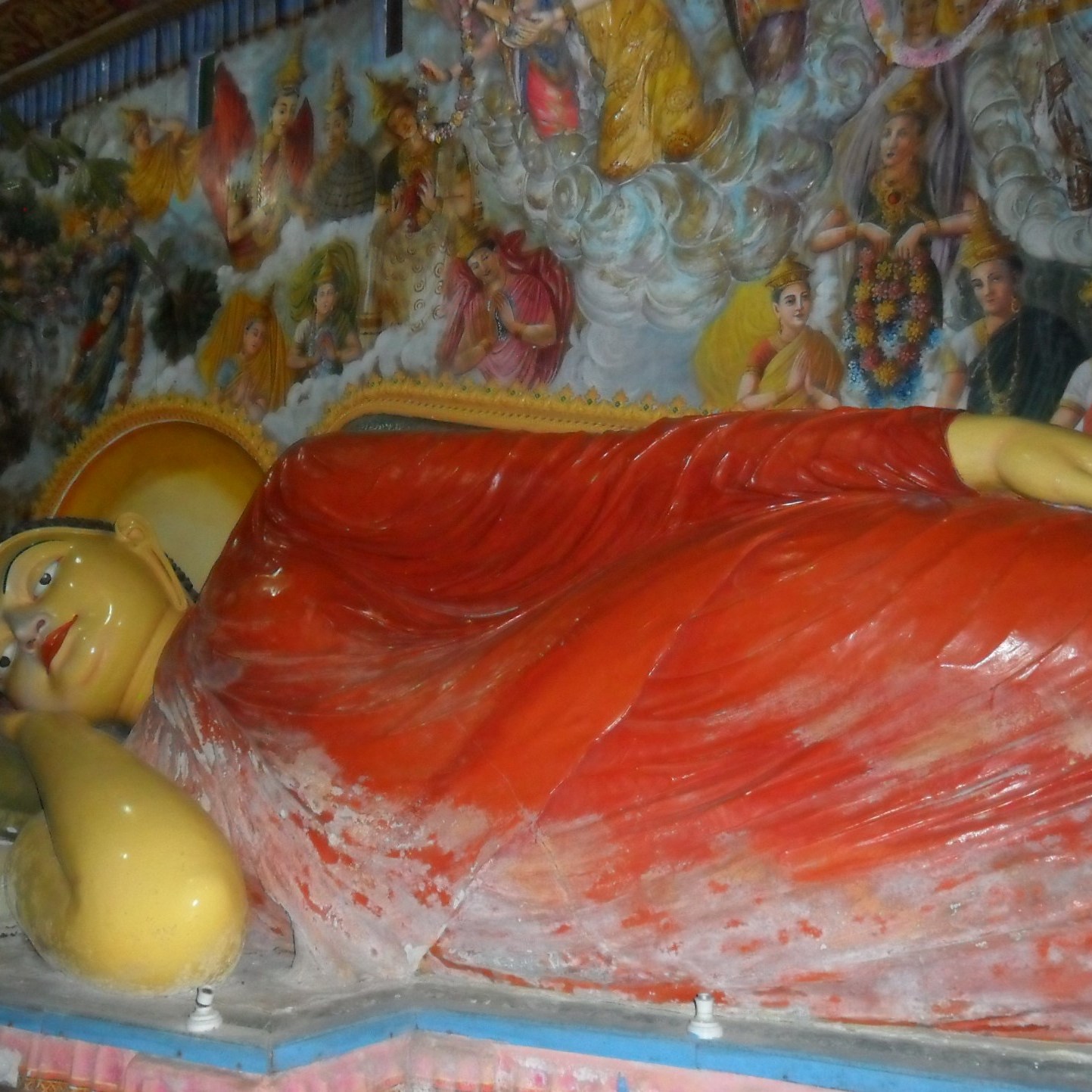 A 300 year old temple. Although it is tiny, it contains wonderful paintings and statues inside. The marble statue in the center originated from Burma The other two made in Sri Lanka are smaller concrete statues. We were told reclining Buddha was designed to depict the dead Buddha.