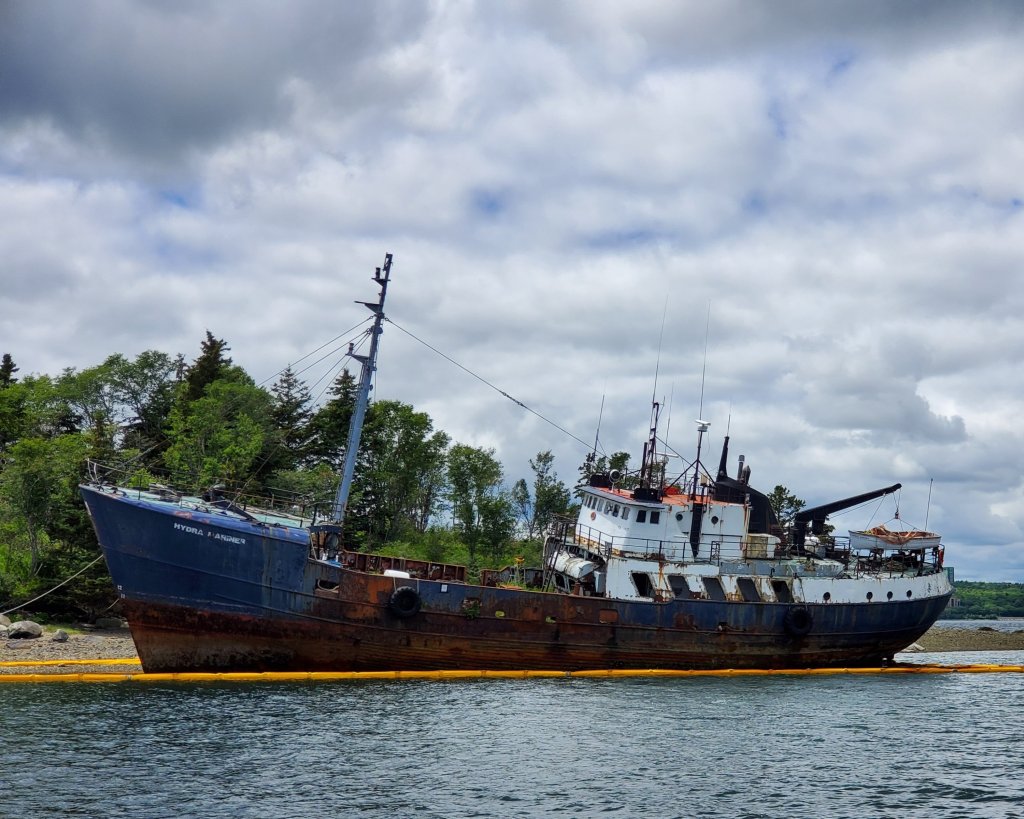 The Canadian Coast Guard is trying to figure out what to do with a steel-hulled vessel that escaped its moorings in December 2020 in Halifax’s Bedford Basin. It drifted to the shores of a small island, where it sits today..