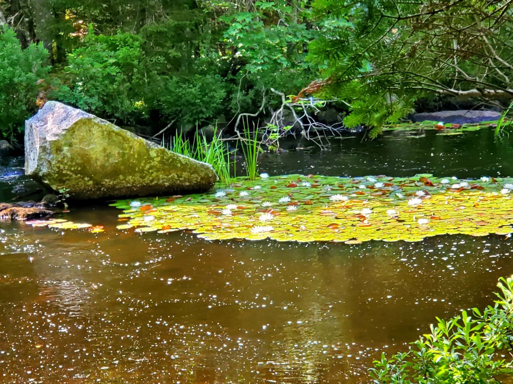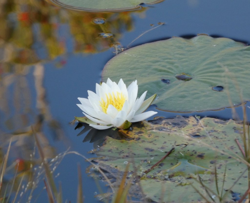 Walking along the trail and I noticed the White water-lily in the pond. It has lily pads and massive, white flowers float at the water’s surface.