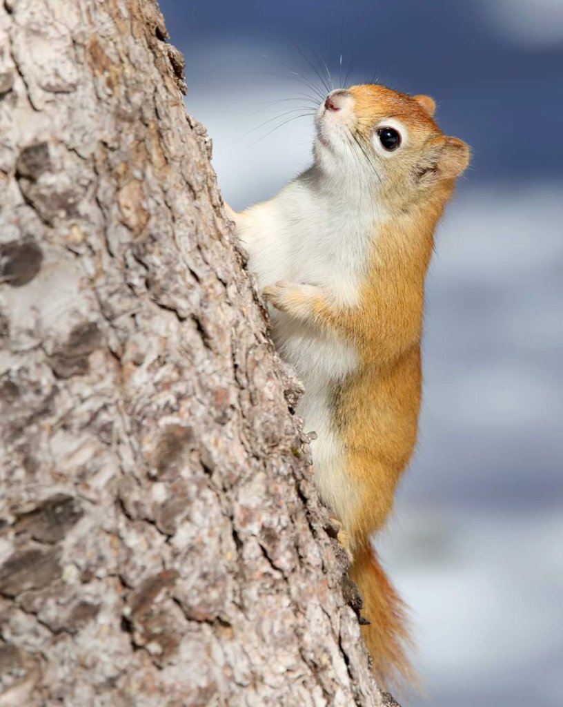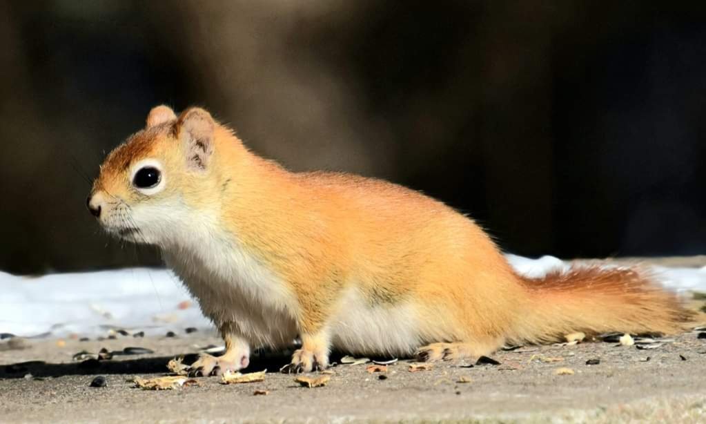 This Chipmunk is part of the Squirrel Family. They have red fur with short ears and bushy fuzzy Tails. Later people are putting seeds and nuts on the trail and they are hungry.