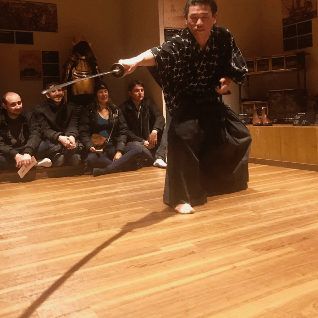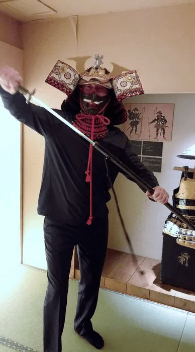 They have replica suits of armor and some other original items on display. Pat dressed in samurai armor with a helmet and sword (not a real one of course!) The real sword demonstrations were a highlight.