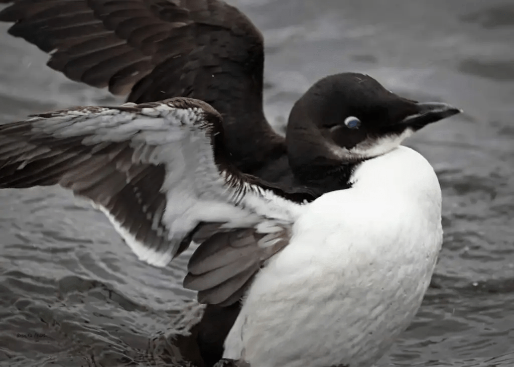 Thick-billed Murre looks like a large Penguin Bird. They have long necks and a pointed bill. He has a white line down the sides of the bill. He is swimming around in ocean water and he is a great poser.