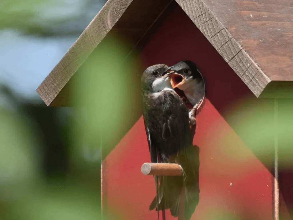 Mama Tree Swallow is feeding her baby in this new bird house. I watched for half an hour. She was so protective.