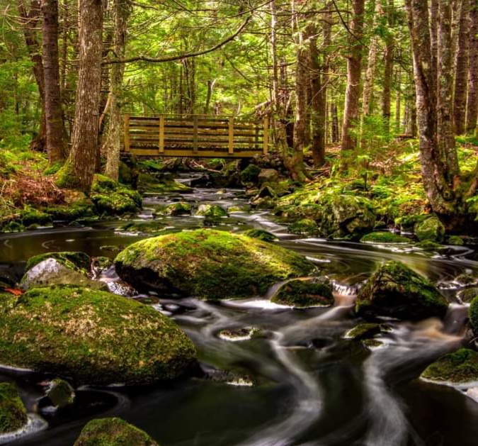 Acacia Valley Trails Digby Co. Nova Scotia We walked along and saw this stream through these woods. This was a definitely an orange tall Toadstool in the woods We saw this Bridge over the stream and this green moss was on these rocks.
