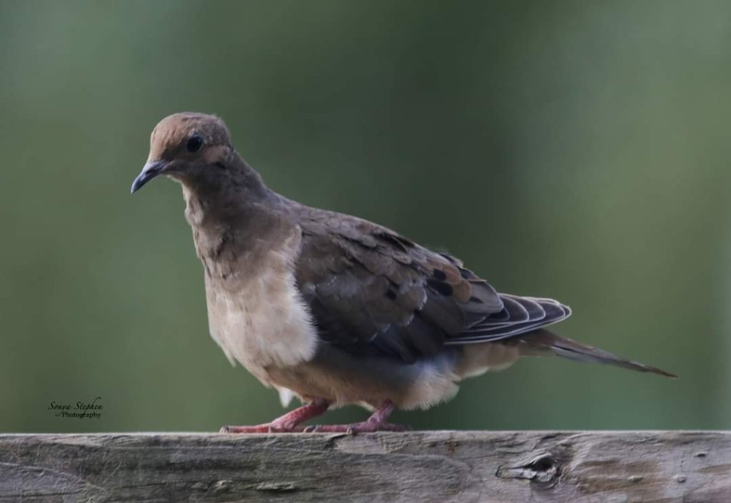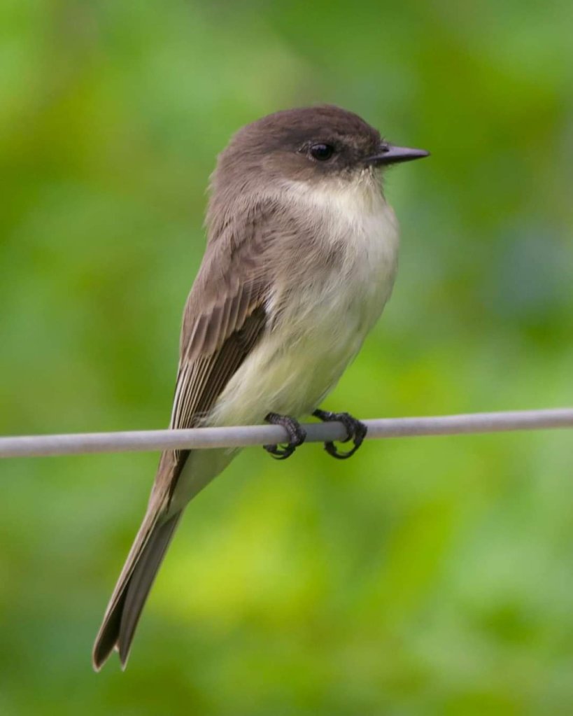 Eastern Phoebe fly catcher has a fat neck and chest. He is cleaning up a few insects in our backyard