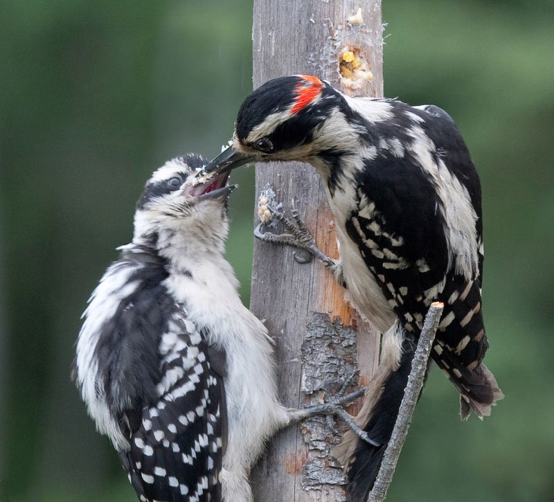 The Downy Woodpecker has black and white plumage. Its back and wings are black with white spotting, while its underside is mostly white. The male Downy has a red patch on the back of its head. The Downy Woodpecker’s bill is short but very chisel-like, enabling it to bore into trees.