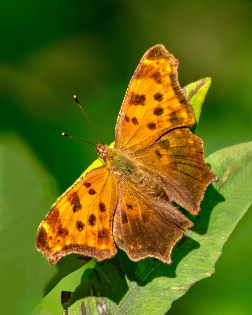 Pair of Northern spread wing (Lestes disjunctus) – a male and a female damselfly in tandem mating position. I saw this Dragonfly seen in the Marsh. This Comma Butterfly is so beautiful This is closer seeing this Brown Eyed Butterfly