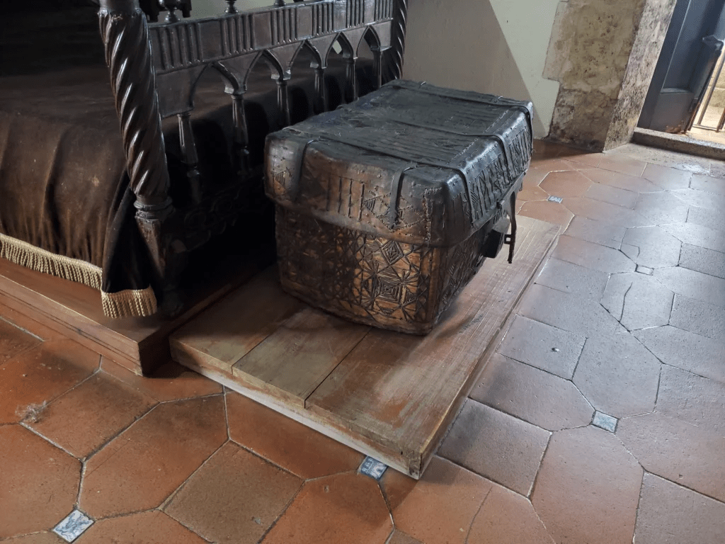 This elephant skin box was by foot of the bed. It was so interesting. Such historic furniture here .