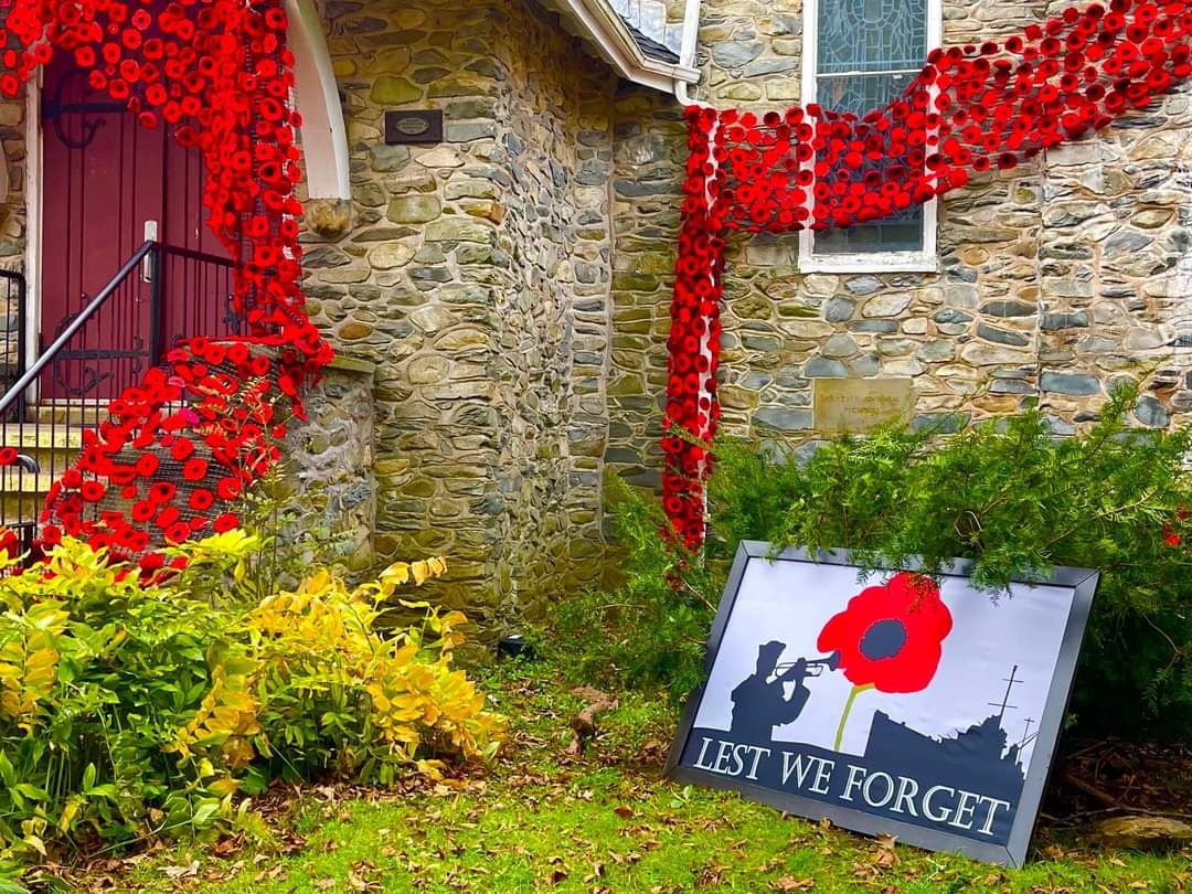 Dartmouth. NS. We walked by and saw this Honour of Rememberence Day. They are all crocheted over this house. We saw this sign Lest We Forget