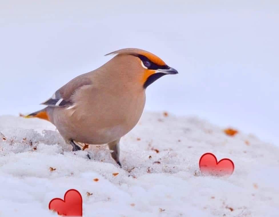 Bohemian Waxwing staring hearts on the snow