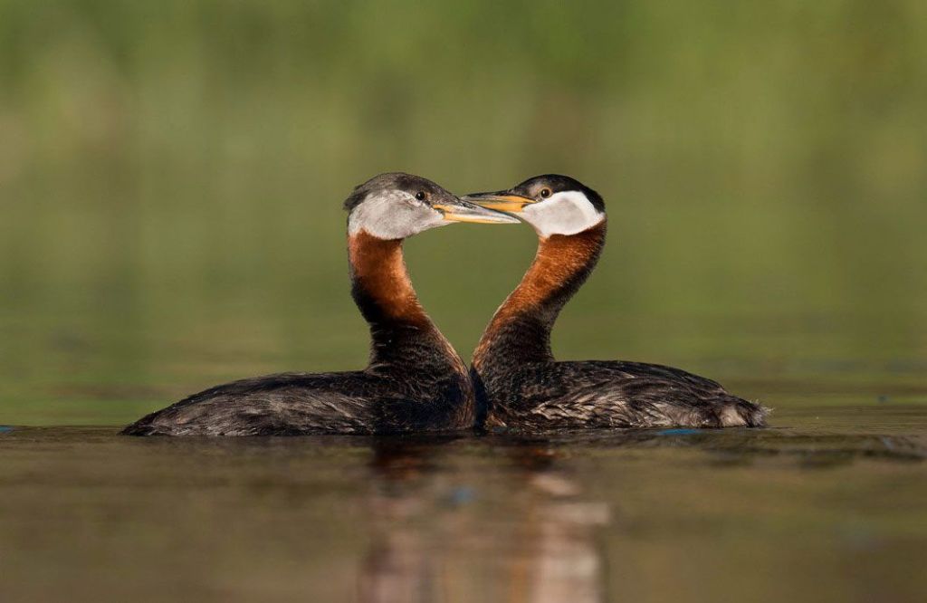 RED NECKED GREBES IN THE WATER WITH THIS VALENTINE HEART